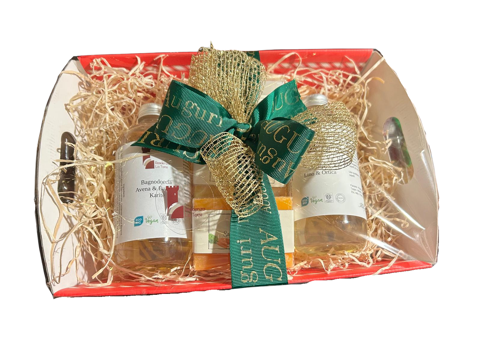 Cesto Natalizio Saponi Artigianali Naturali Made in Italy. Il cesto è costituito da n.1 docciaschiuma all'avena e burro di karitè, n.1 shampoo lino e Ortica, 3 saponette a scelta tra Mandorla, Argilla, Calendula, Bardana, Struccante, Camomilla e Limone, 1 Segnalibro realizzato con la tecnica della stampa botanica - Folia Stampa Botanica.